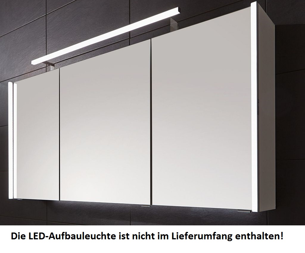Der 130 cm breite Puris Linea Badmöbel Spiegelschrank besteht aus 3 Spiegeltüren, 3 Glasfachböden, 1 Schalter-Steckdosen-Element und 2 seitlichen LED Beleuchtungsprofilen.
