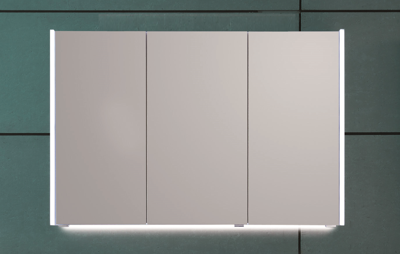 - Beim dreitürigen Spiegelschrank können Sie Zusatzbeleuchtungen in Form einer LED Aufbauleuchte und / oder einer Waschplatzbeleuchtung auswählen.