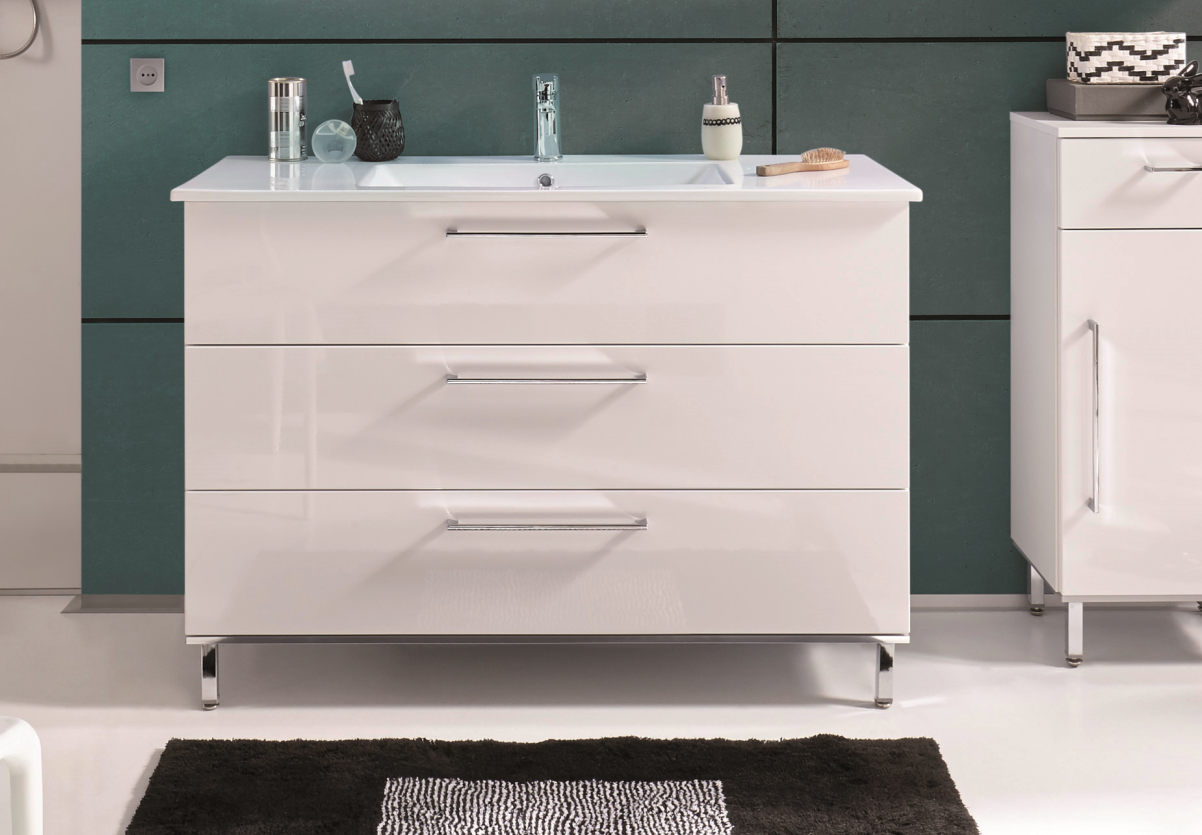 - 1x Waschtischunterschrank - 120 cm breit: 1 Auszug mit Einzugsdämpfung und Siphonausschnitt, 2 Auszüge mit Einzugsdämpfung, 1 Dekorboden mit Chromkante, 4 Zierfüße in chrom