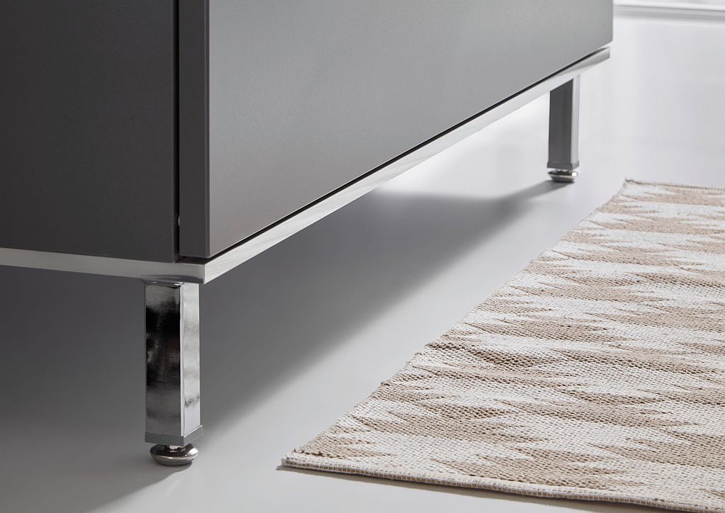 Die Badezimmermöbel von Puris Quada haben ein einzigartiges Erkennungsmerkmal. Das Waschbecken mit Unterschrank ist mit einem modernen und stilvollen Dekorboden mit Chromkante und vier Zierfüßen aus Chrom ausgestattet. Die schönen Stangengriffe runden das Design der Puris Quada Badmöbel harmonisch ab.