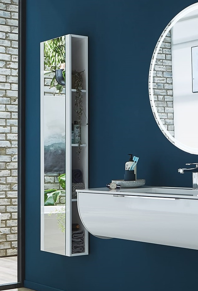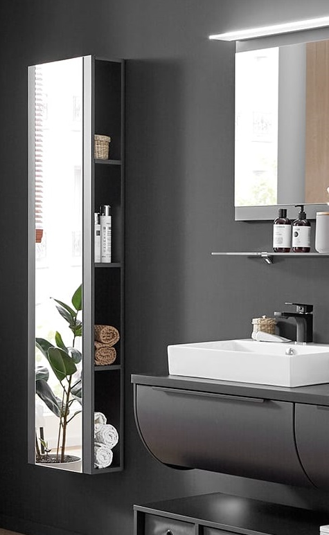 Das Hochschrank-Regal besteht aus einer verspiegelten Tür und 3 Holzfachböden. Es lässt sich in fast jedem Einrichtungsstil integrieren und sorgt für ausreichend Stauraum zur Aufbewahrung von Handtüchern und täglichen Pflegeprodukten.