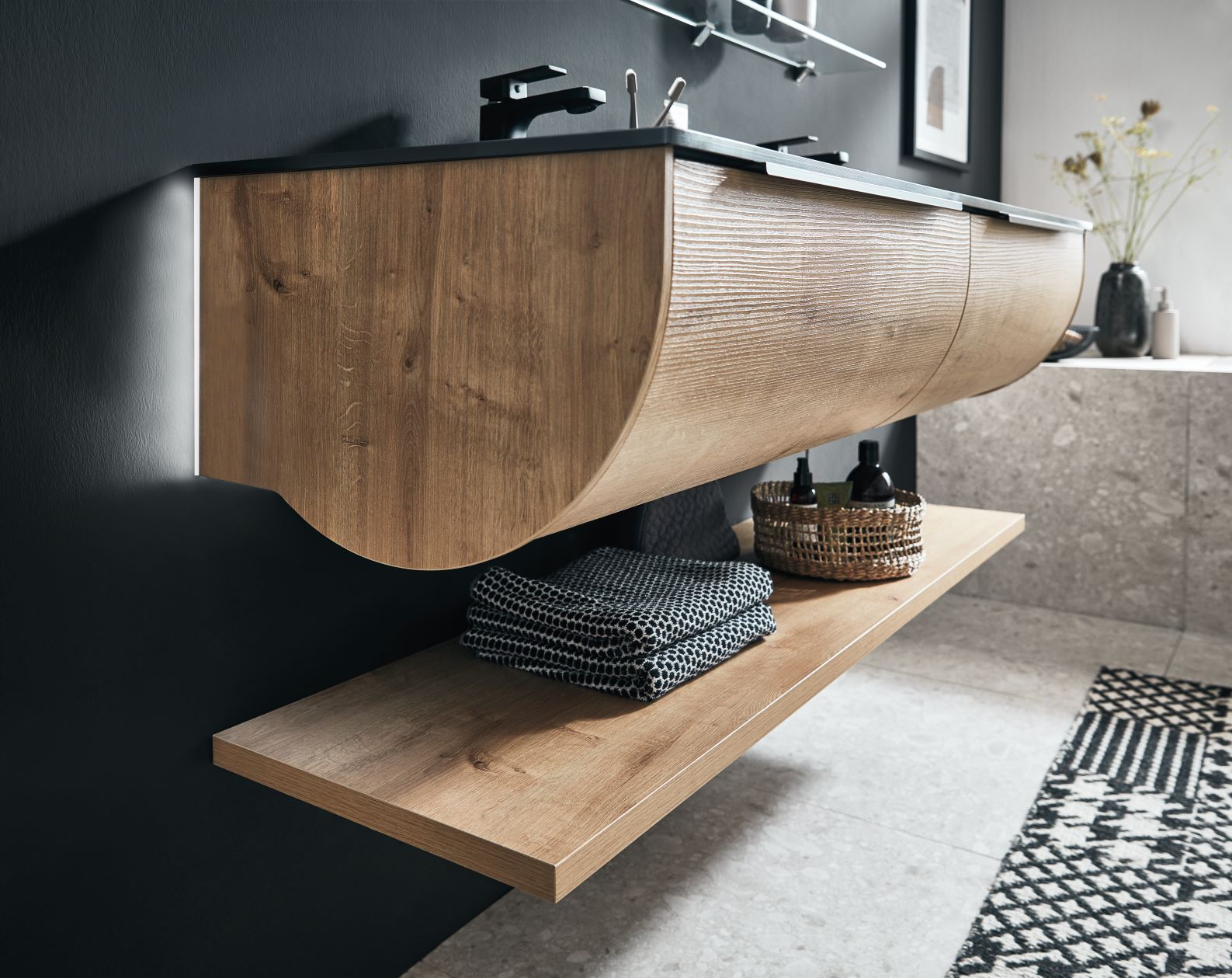 - Mitteldichte Faser Platte, formschlüssig, mit hochflexibeler Holzbeschichtung erprobt fürs Bad