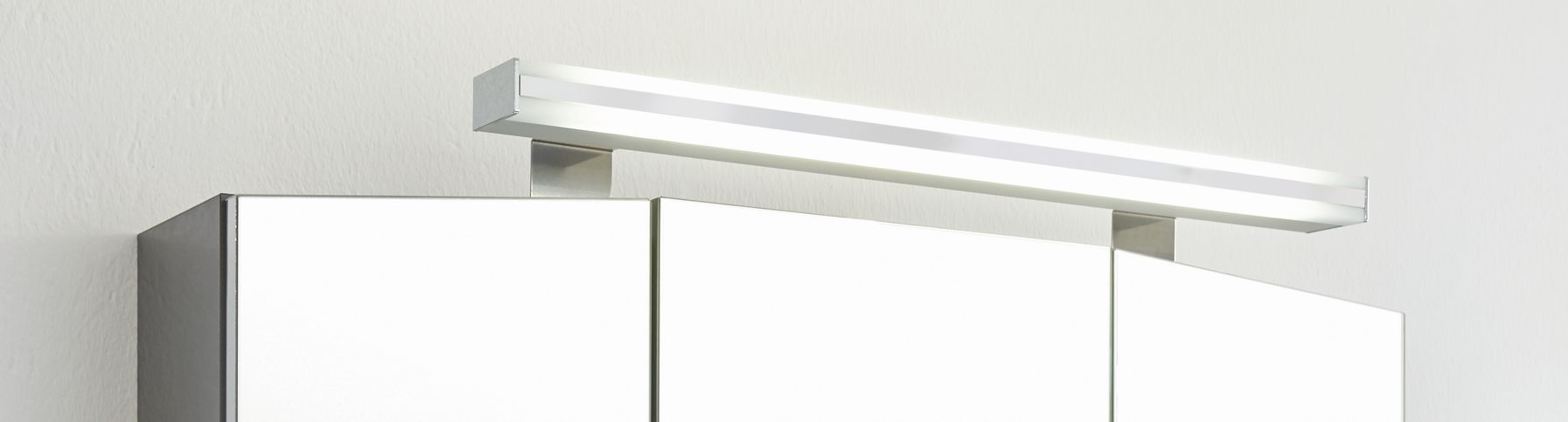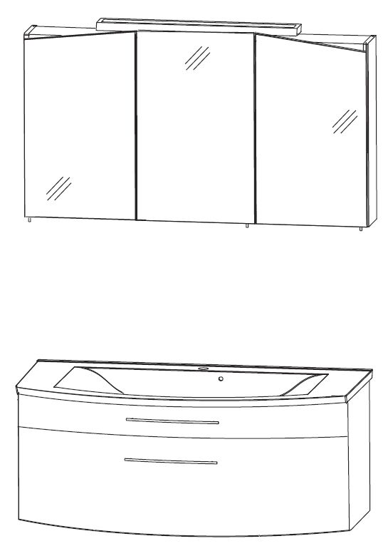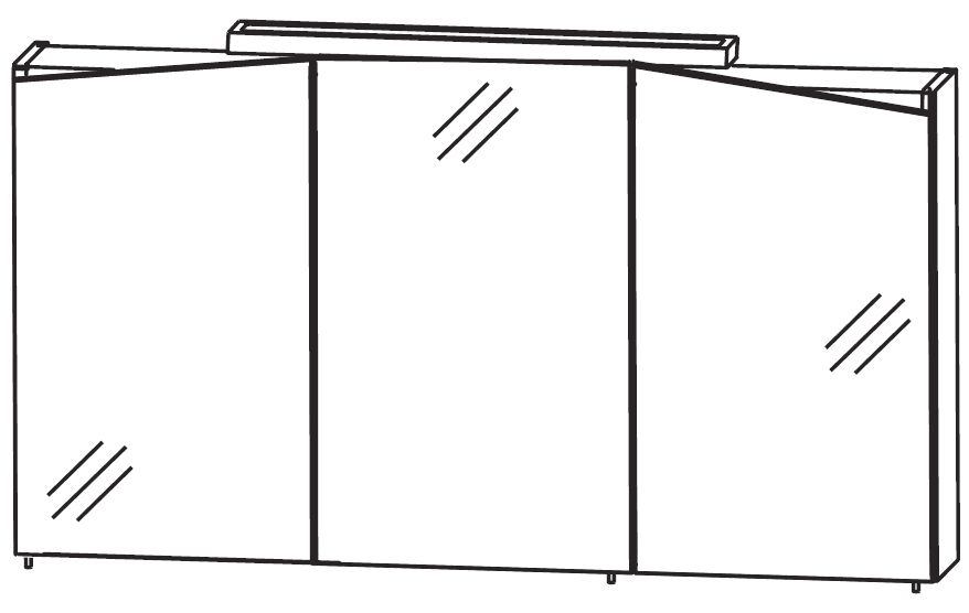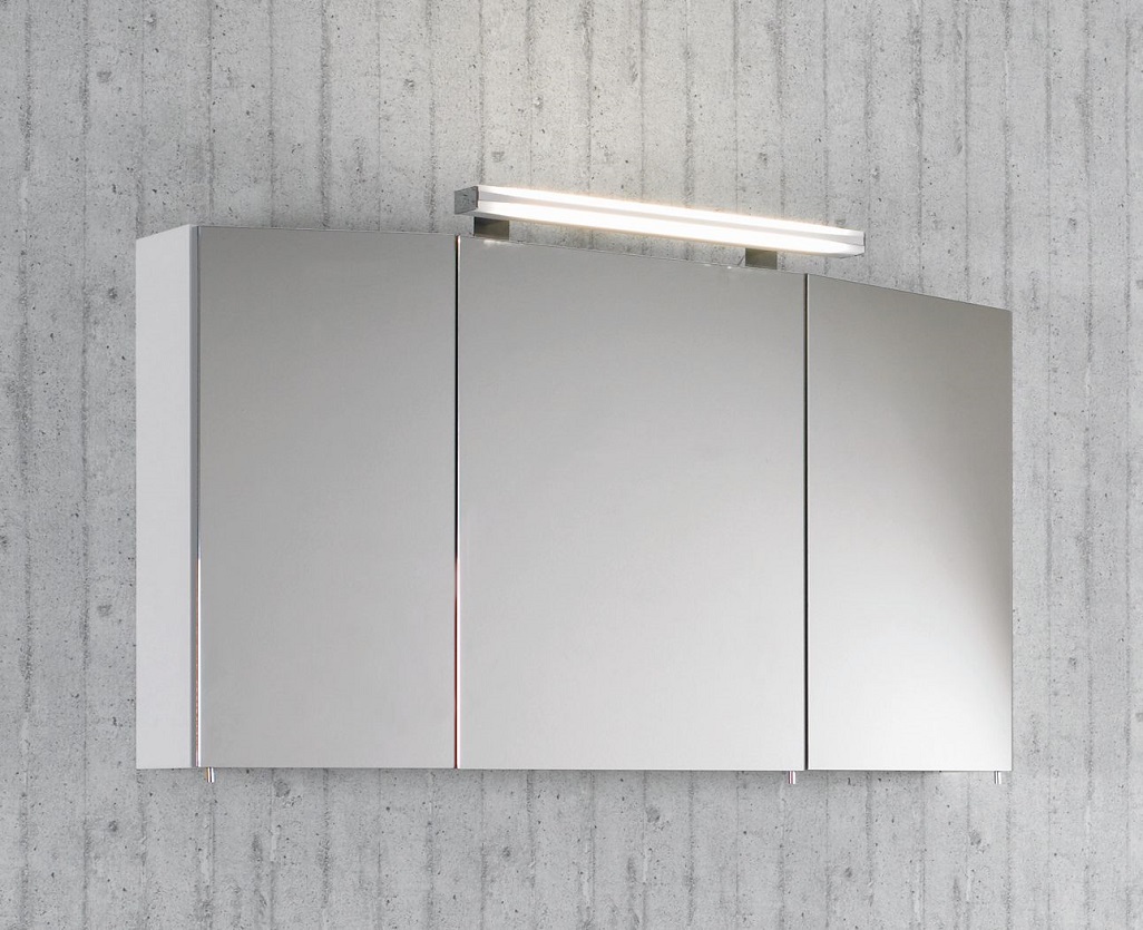 Das Badmöbel Set wird mit einem dreitürigen Puris Speed Spiegelschrank ergänzt. Der Puris Speed Spiegelschrank ist mit drei Spiegeltüren auf Trägerplatte, Einlegeböden aus Glas, einem Schalter-Steckdosenelement und einer Aufbauleuchte versehen. Das besondere an den Speed Bad-Spiegelschrank sind die schrägen Außentüren.
