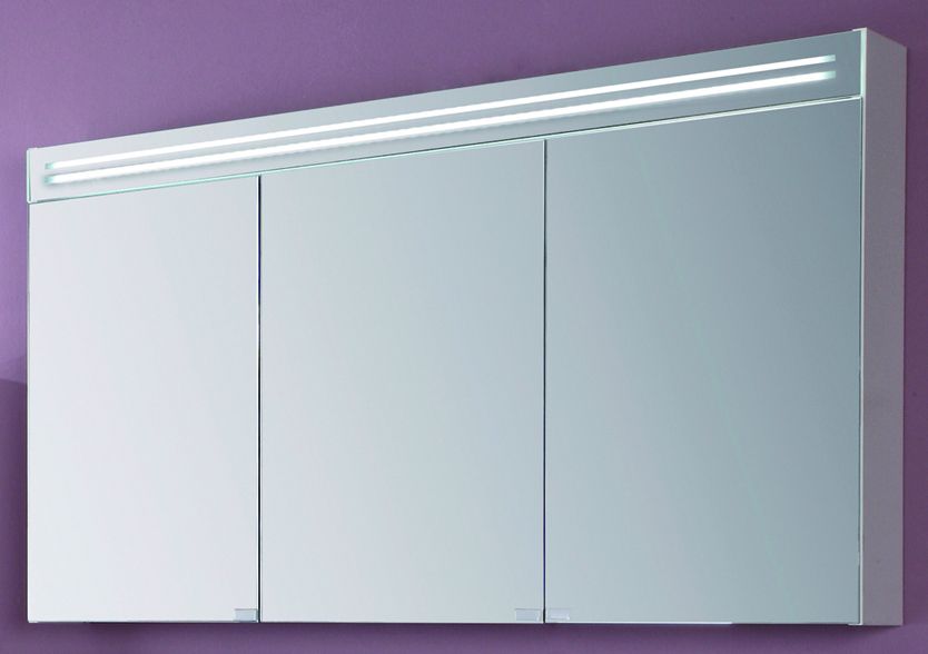 Der Puris Star Line Spiegelschrank S2A58126 besteht aus drei Doppelspiegeltüren, zwei Mittelwände, sechs Glaseinlegeböden, einem Schalter-Steckdosenelement und einer Spiegelblende inkl. LED-Beleuchtung.