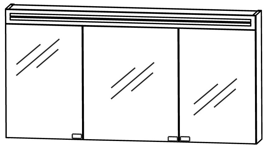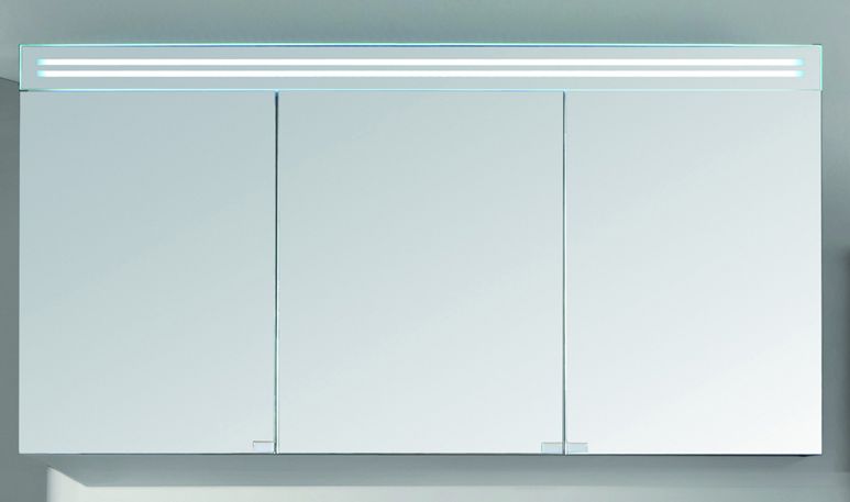 Der geradlinige und moderne Puris Star Line Spiegelschrank ist 140 cm breit, 72 cm hoch und 15 cm tief. Der Bad-Spiegelschrank ist mit drei Doppelspiegeltüren, zwei Mittelwände, sechs Glasfachböden, einem Schalter-Steckdosen-Element sowie einer Spiegelblende inklusive LED Beleuchtung ausgestattet.