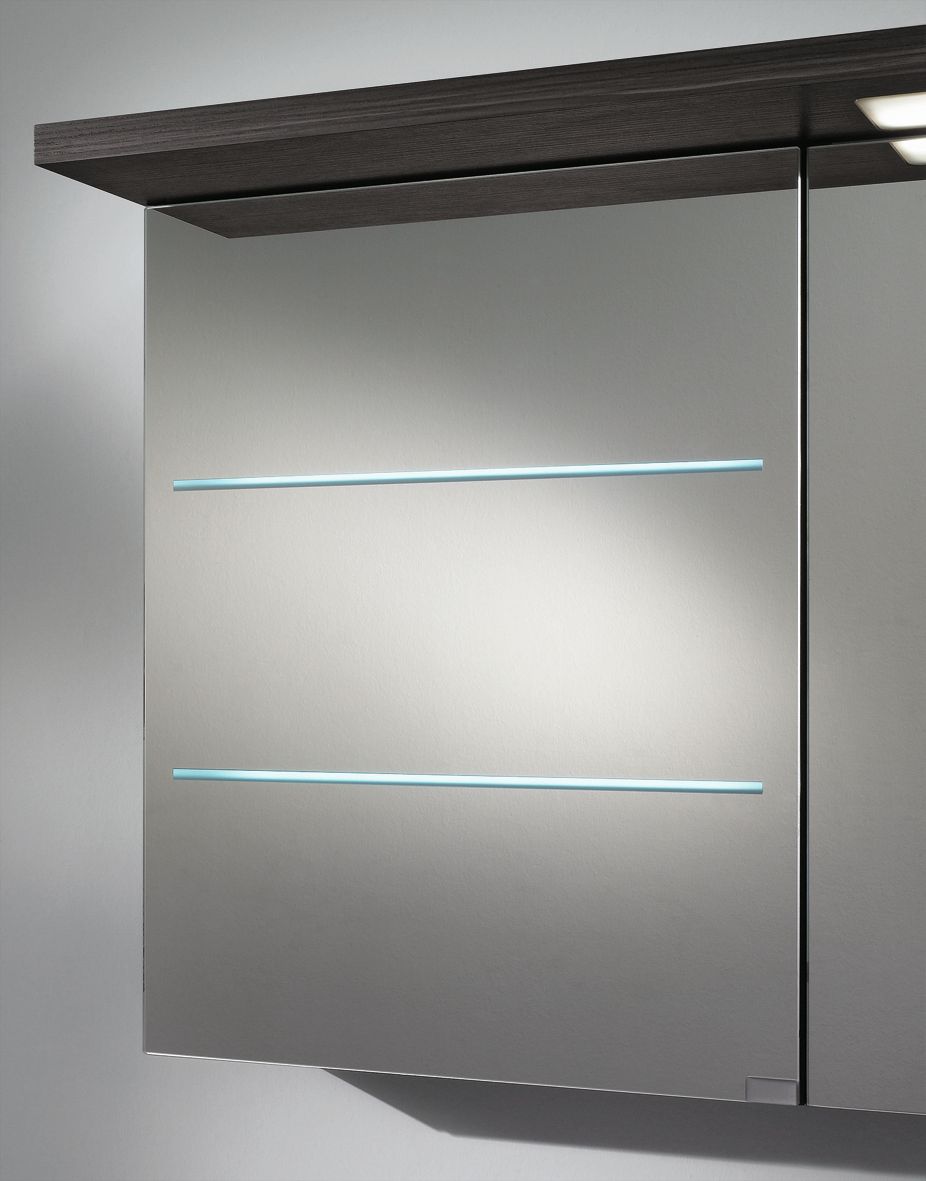 Ein optischer Blickfang vom Puris Swing Spiegelschrank ist die linke Spiegeltür, welche mit zwei sandgestrahlten LED-Lichtfenster ausgestattet ist. Dies verleiht dem Spiegelschrank den letzten modernen Feinschliff.