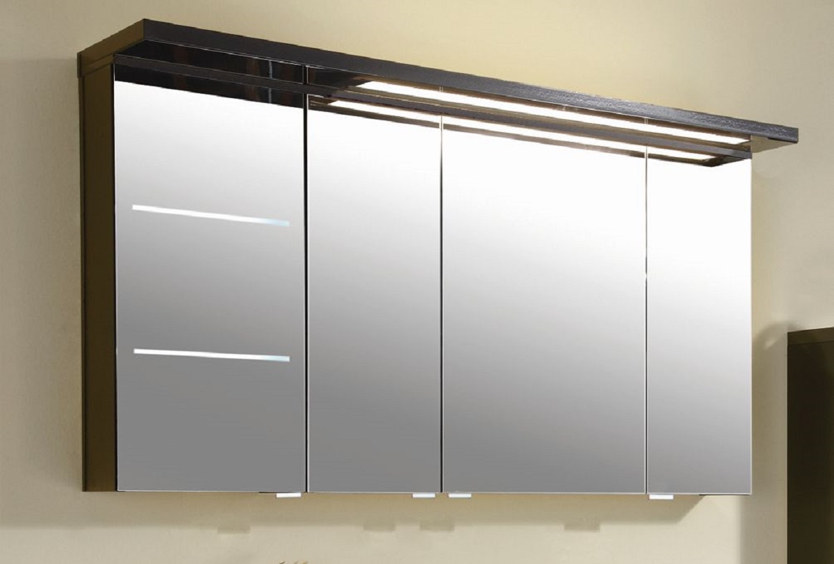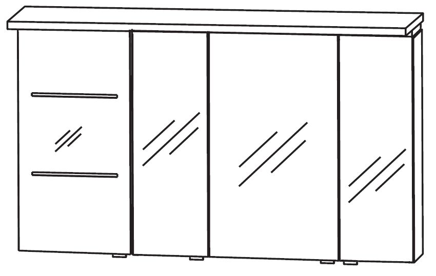 Der Puris Spiegelschrank ist 68 cm hoch, 15 cm tief und 120 cm breit. Das Badezimmermöbel besteht aus vier Doppelspiegeltüren, Einlegeböden aus Glas, einem Schalter-Steckdosenelement und aus einem Gesimsboden mit integrierter LED-Beleuchtung. Die Spiegeltüren haben die Breiten 29,6 cm / 23,8 cm / 41,2 cm / 23,8 cm und sind mit eleganten Griffblöcken verziert. Dadurch vermeidet man unnötige Fingerabdrücke auf der Spiegelfront.