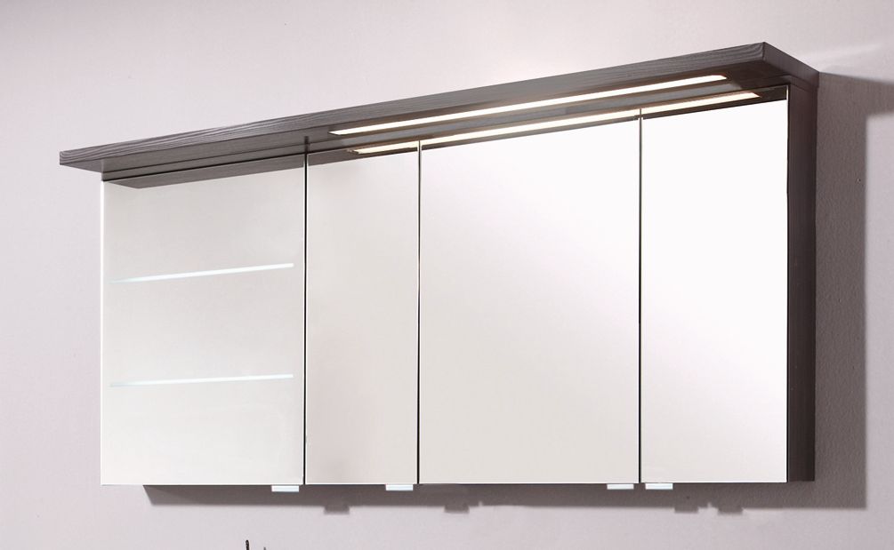 Der Puris Swing Spiegelschrank 140 cm breit SET40142L setzt sich aus 4 Doppelspiegeltüren, Schalter-Steckdosen-Element, Gesimsboden mit LED-Beleuchtung und 2 Mittelwände zusammen.