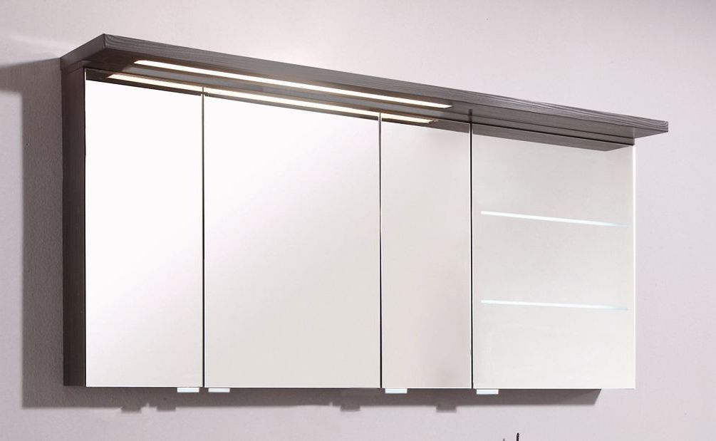 Der Puris Swing Spiegelschrank 140 cm breit SET40142R setzt sich aus 4 Doppelspiegeltüren, Schalter-Steckdosen-Element, Gesimsboden mit LED-Beleuchtung und 2 Mittelwände zusammen.