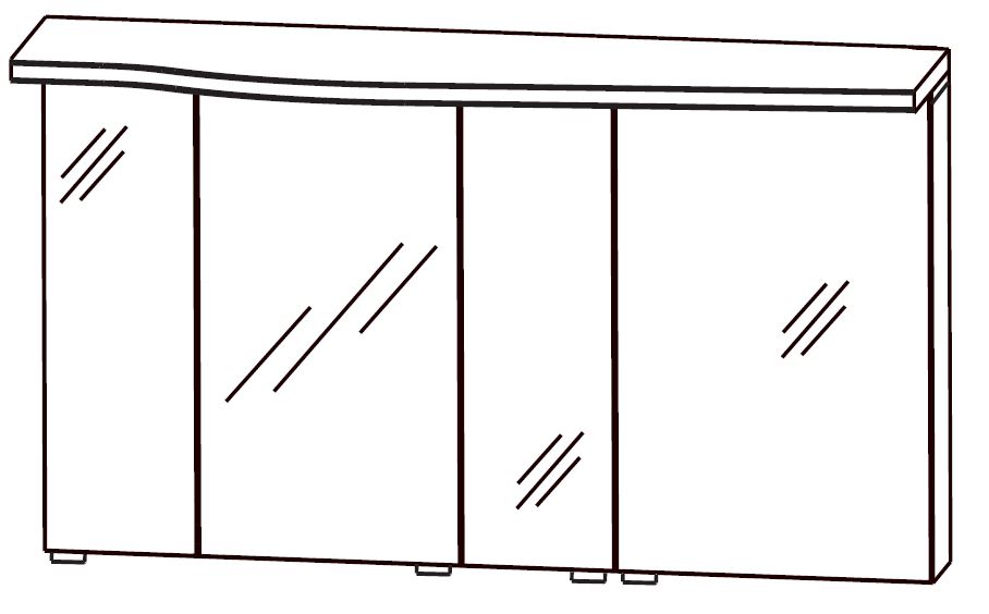 Der Lieferumfang des Spiegelschranks "Puris Swing Spiegelschrank 140 cm breit SET40143R" setzt sich aus 4 Spiegeltüren auf Trägerplatte, 3 Mittelwände, Schalter-Steckdosen-Element, formgefräster Gesimsboden mit 4 LED-Einbaustrahler und Zwischenplatte zusammen.