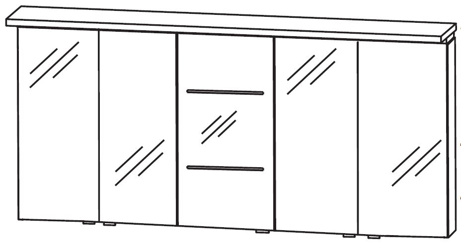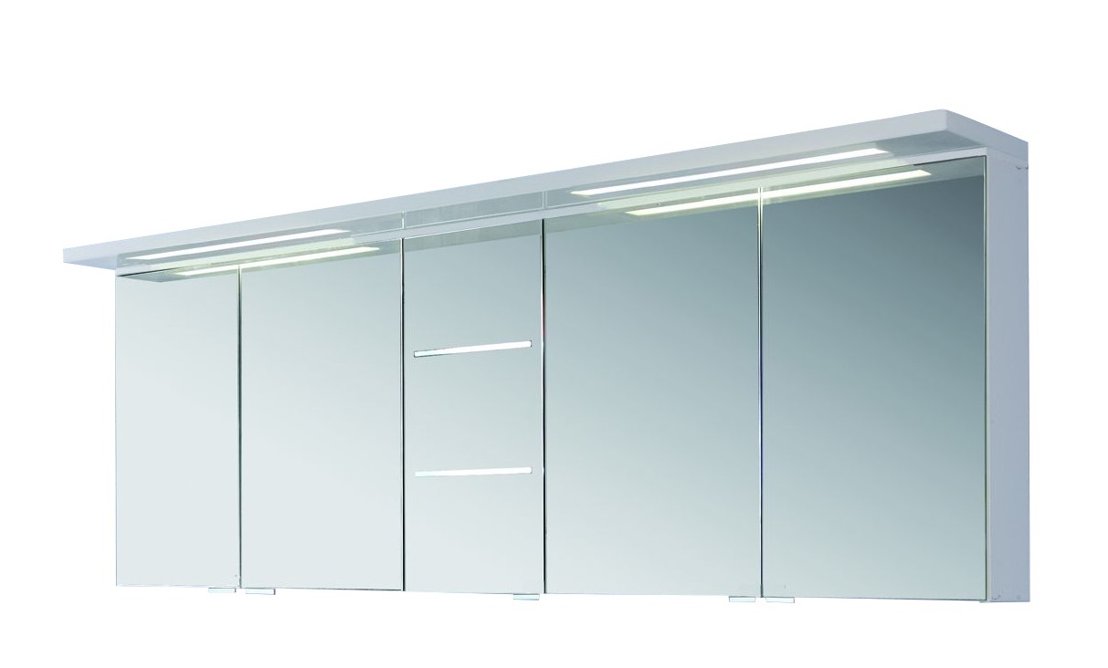 Der Lieferumfang des Spiegelschranks "Puris Swing Spiegelschrank 180 cm breit SET40182 L/R" setzt sich aus 5 Doppelspiegeltüren, 2 Schalter-Steckdosen-Elemente und Gesimsboden mit LED-Beleuchtung zusammen.