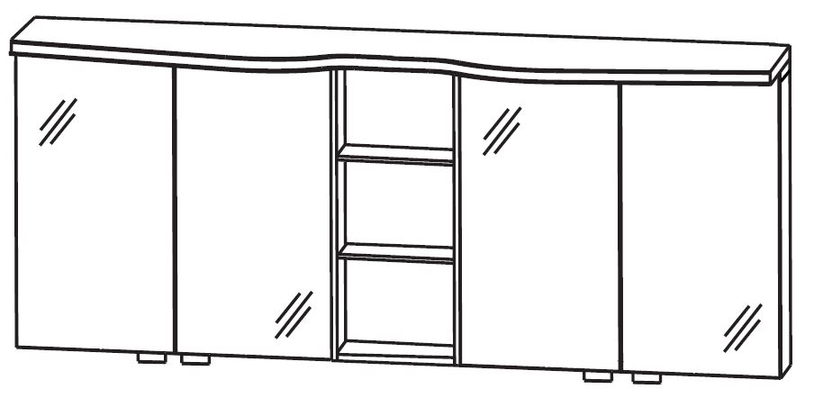 Der Lieferumfang des Spiegelschranks "Puris Swing Spiegelschrank 180 cm breit SET41183" setzt sich aus 4 Spiegeltüren auf Trägerplatte, 2 Schalter-Steckdosen-Elemente, formgefräster Gesimsboden mit 5 LED-Einbaustrahler, Zwischenplatte und Regal mittig zusammen.
