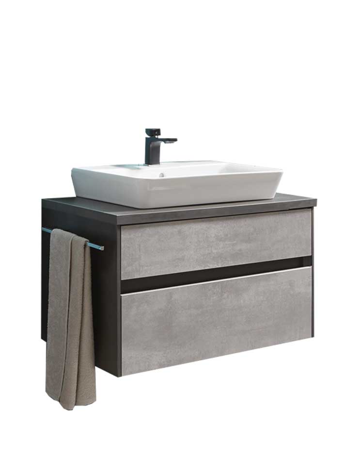 Unterhalb des modernen Puris Unique Aufsatzbecken befindet sich die passende Waschtischplatte, welche wahlweise mit dem passenden Waschtischplattenausschnitt bestellt werden kann. Das Besondere an der Puris Waschtischplatte sind die unterschiedlichen Dekorfarben, welche individuell ausgewählt werden können.