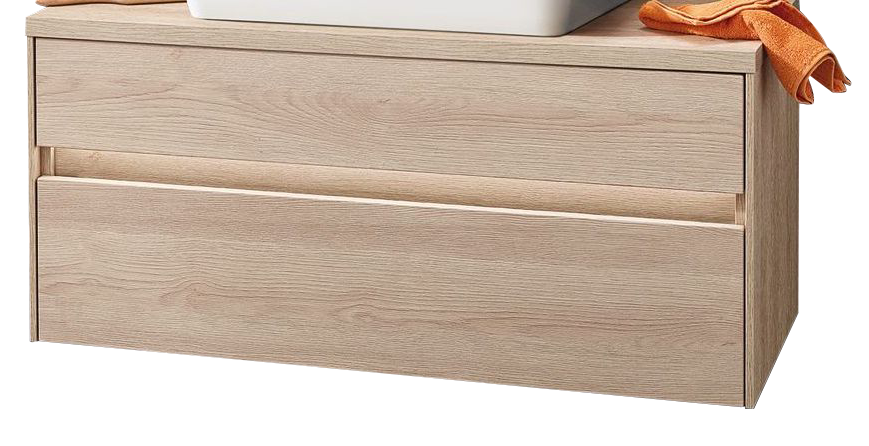 Der Puris Unique Waschtischunterschrank wird mit einer passenden Waschtischplatte ohne Waschtischplattenausschnitt vervollständigt. Das Unterschrank-Set eignet sich für jemanden, der bereits einen individuellen Aufsatzwaschtisch zu Hause hat.