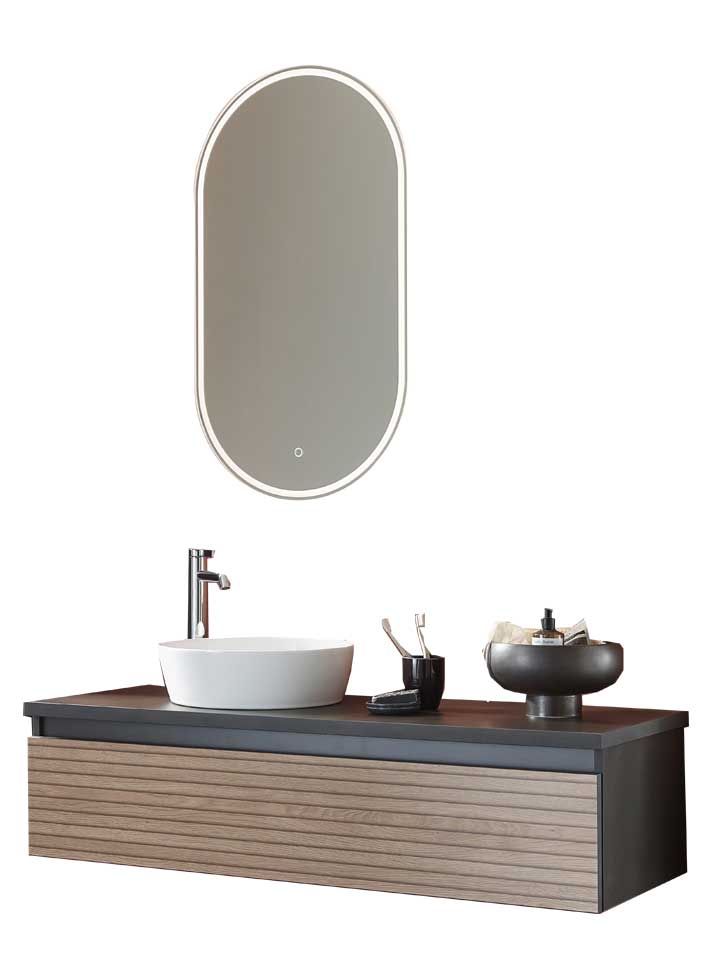 Der große ovale Spiegel verleiht dem Möbelset das gewisse Etwas. Mithilfe des Sensorschalters kann die umlaufende Beleuchtung gesteuert werden.