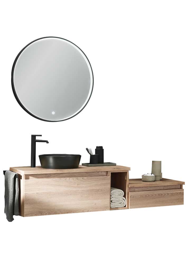 Der große runde Spiegel verleiht dem Möbelset das gewisse Etwas. Mithilfe des Sensorschalters kann die umlaufende Beleuchtung gesteuert werden.