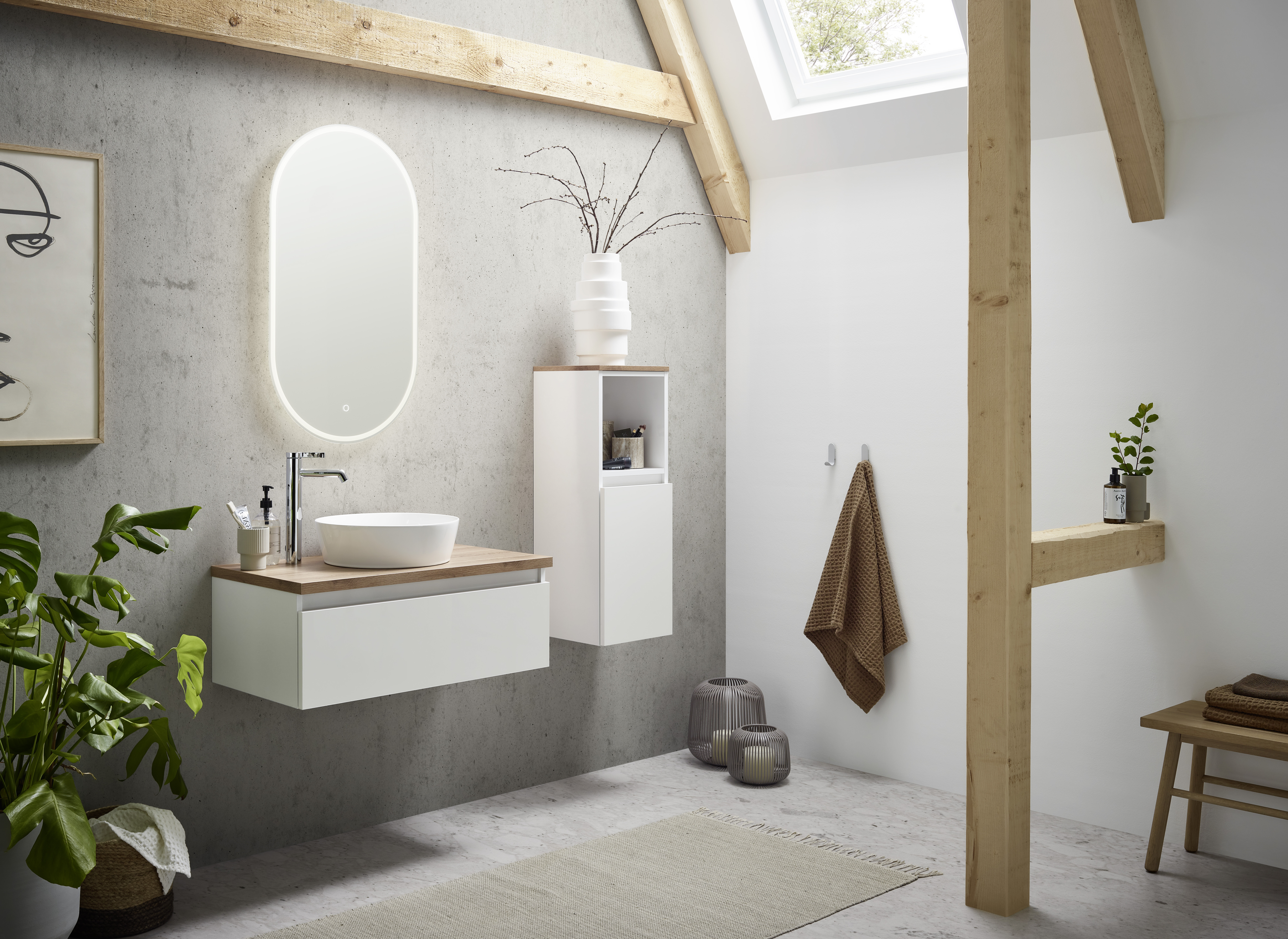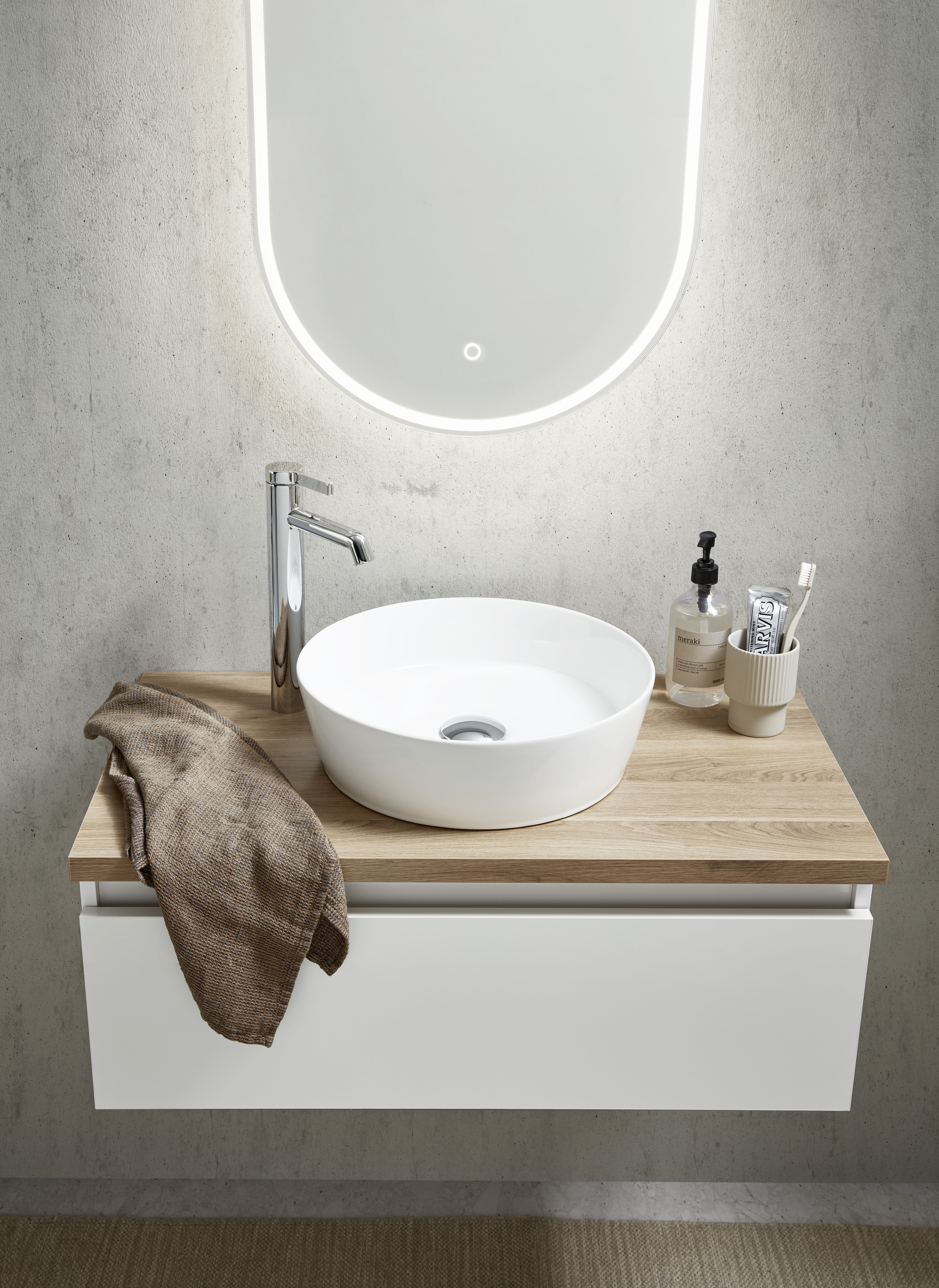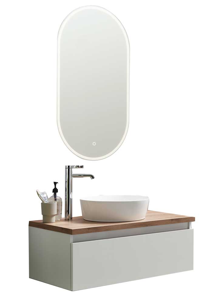 Der große ovale Spiegel verleiht dem Möbelset das gewisse Etwas. Mithilfe des Sensorschalters kann die umlaufende Beleuchtung gesteuert werden.
