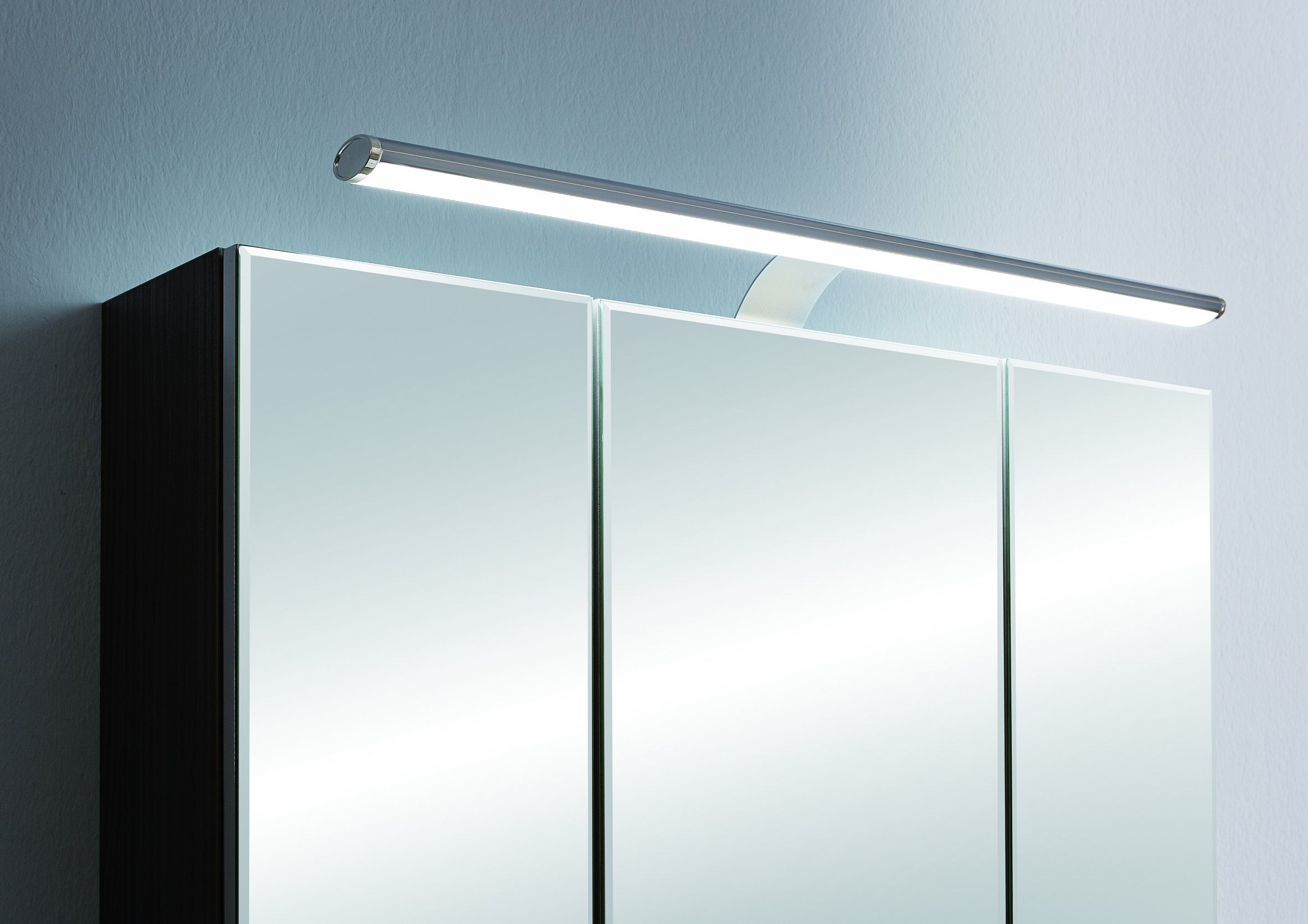 Puris Vuelta Badmöbel Spiegelschrank 70 cm breit S2A437S 1 mit LED-Aufbauleuchte. Der 70 cm breite Puris Vuelta Spiegelschrank S2A437S1 ist mit drei Spiegeltüren auf Trägerplatte, Einlegeböden aus Glas, Schalter-Steckdosenelement und einer LED Aufsatzleuchte ausgestattet. Der geradlinige Badspiegel von Puris Vuelta kann ohne oder mit einem Facettenschliff ausgewählt werden, der dann an den Kanten der Spiegeltüren ersichtlich ist.