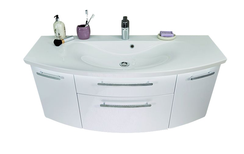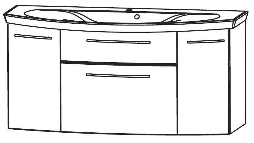 - Waschtischunterschrank - 120 cm breit: 1 Metallauszug mit Einzugsdämpfung und Siphonausschnitt, 1 Metallauszug mit Einzugsdämpfung inkl. Reling, 2 Türen - je 1 Glasfachboden, seitliche Korpustiefe = 23 cm, ohne LED-Beleuchtung