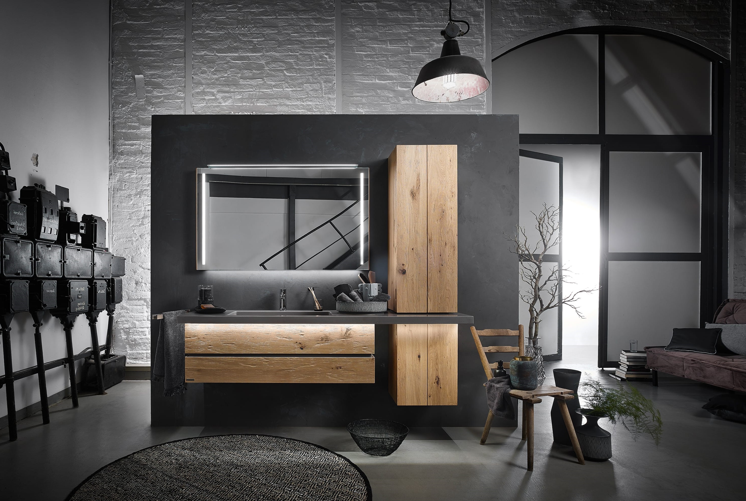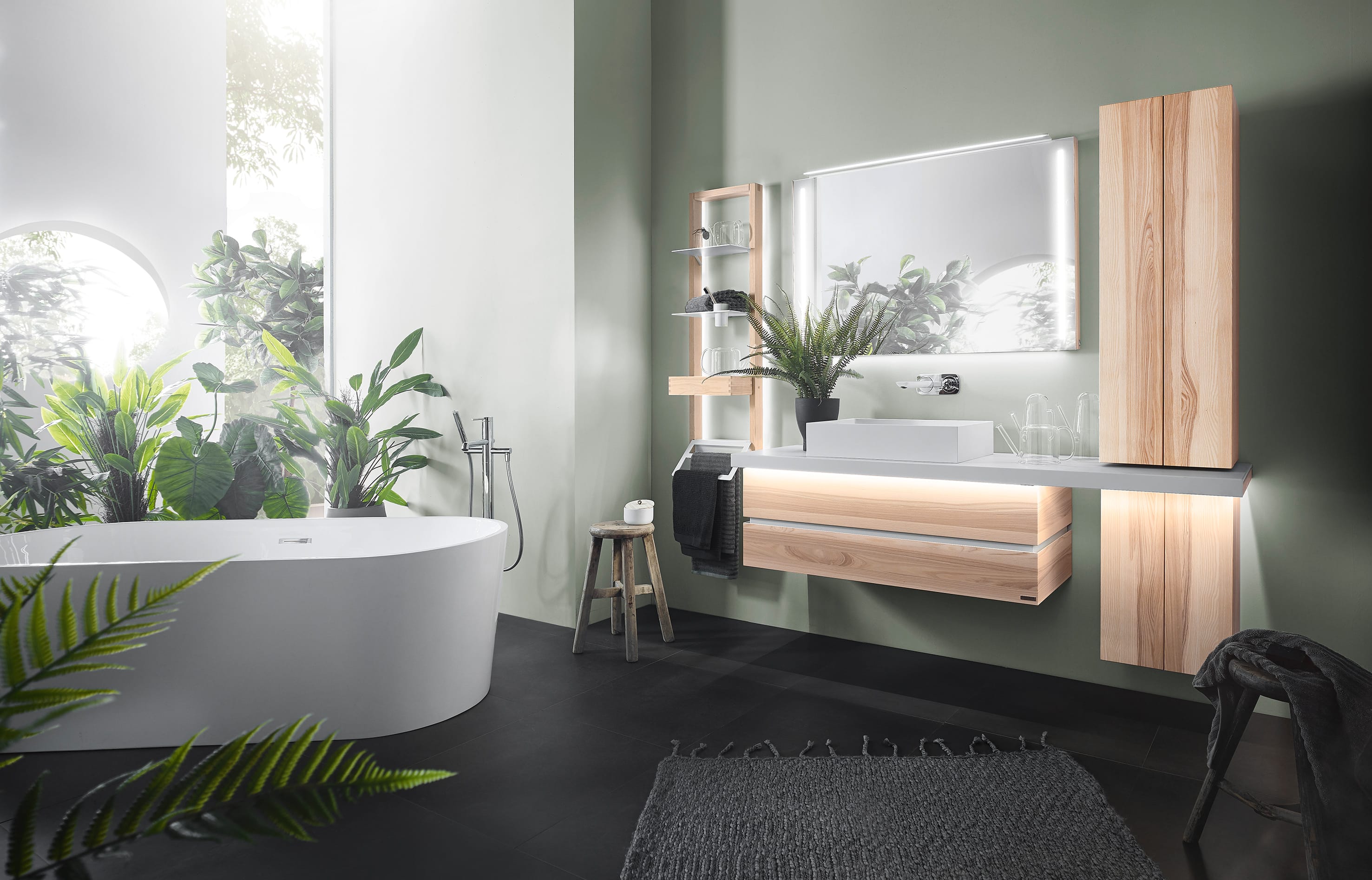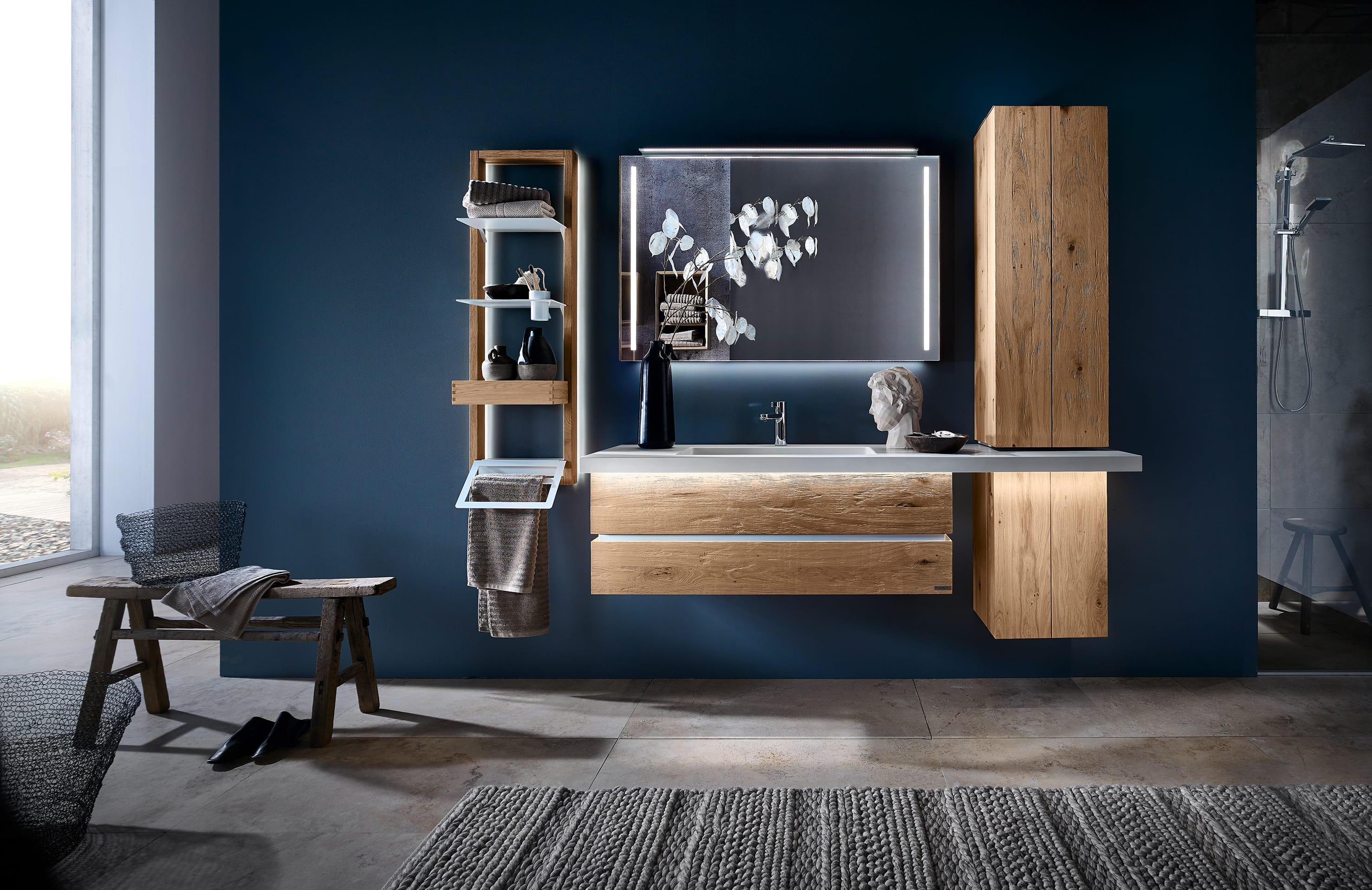 Die Badmöbel-Kombination aus der Serie Fresh vom deutschen Markenhersteller Thielemeyer besticht durch puristisches, geradliniges Design und verleiht dem Raum dadurch eine ursprüngliche Natürlichkeit.
