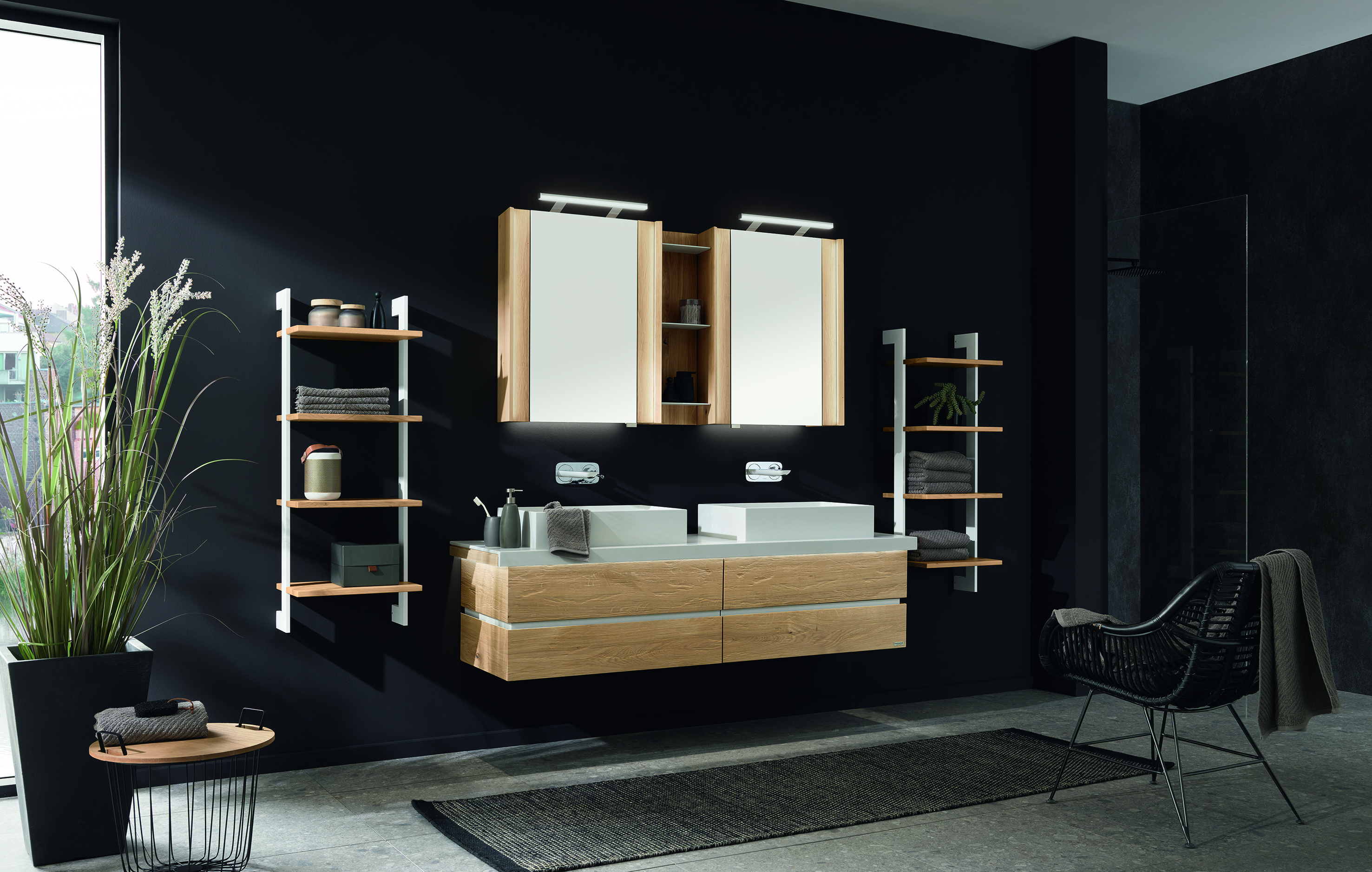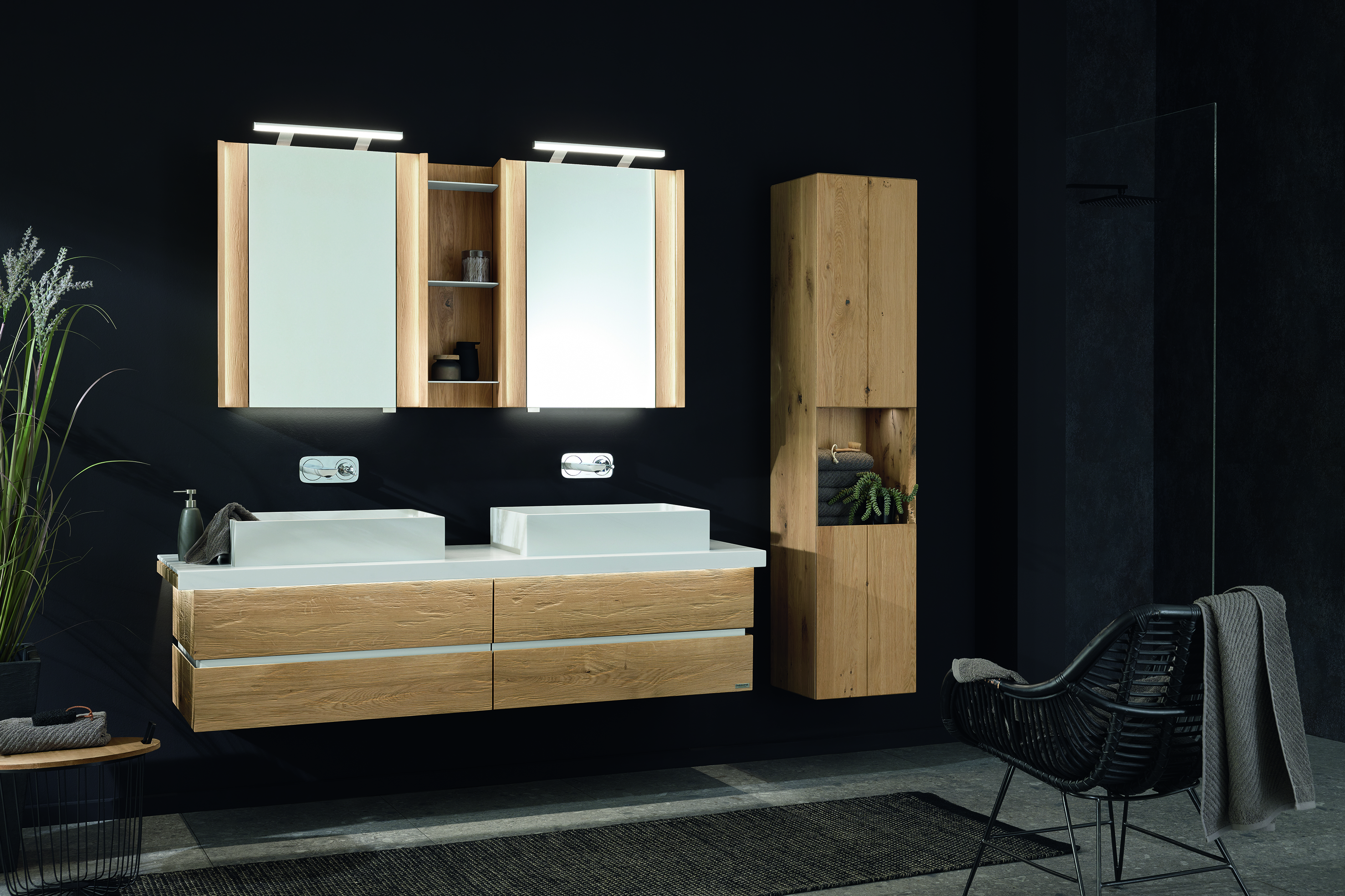 Die Badmöbel-Kombination aus der Serie Fresh vom deutschen Markenhersteller Thielemeyer besticht durch puristisches, geradliniges Design und verleiht dem Raum dadurch eine ursprüngliche Natürlichkeit.