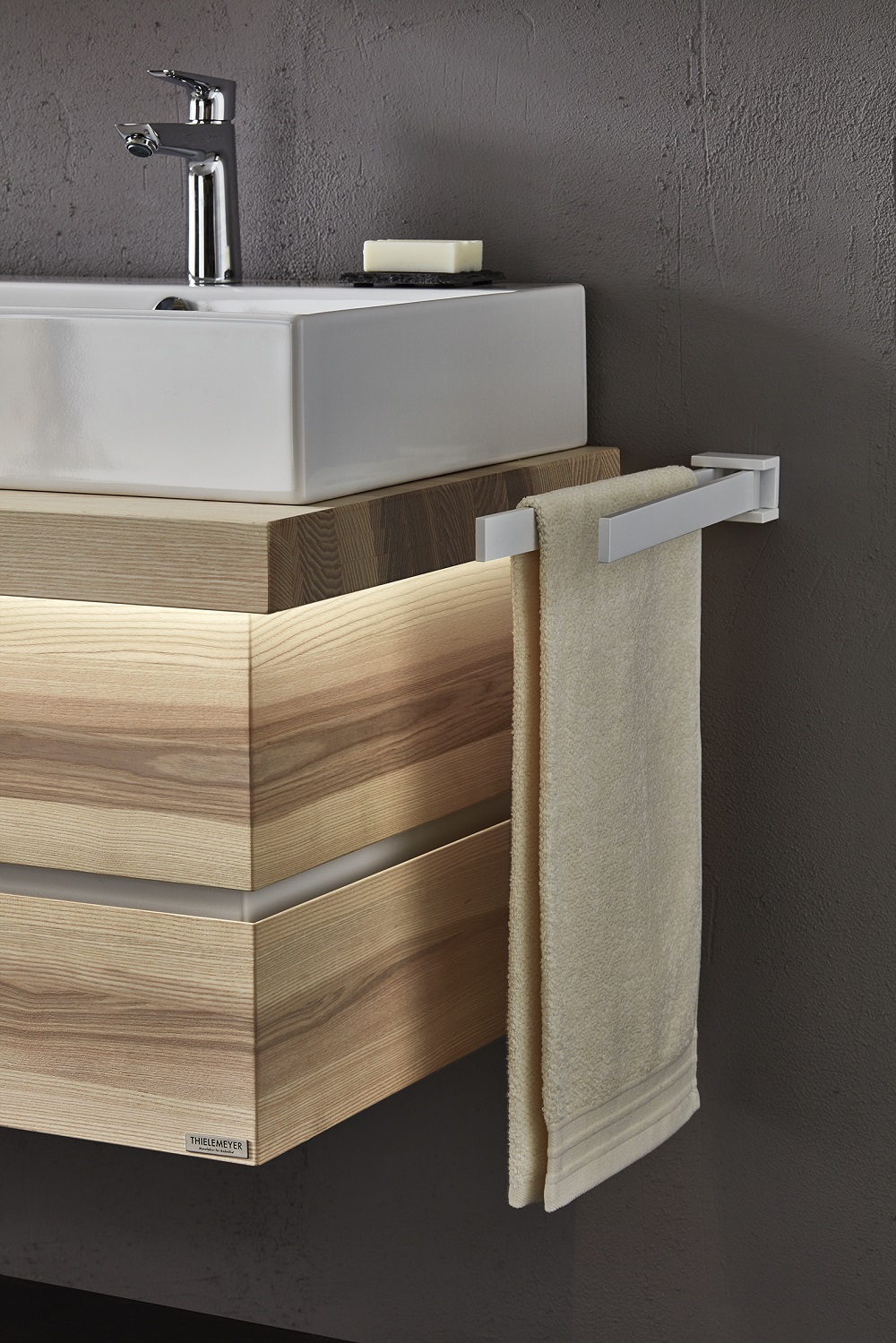 Die Badmöbel-Kombination aus der Serie Fresh vom deutschen Markenhersteller Thielemeyer besticht durch puristisches, geradliniges Design und verleiht dem Raum dadurch eine ursprüngliche Natürlichkeit.