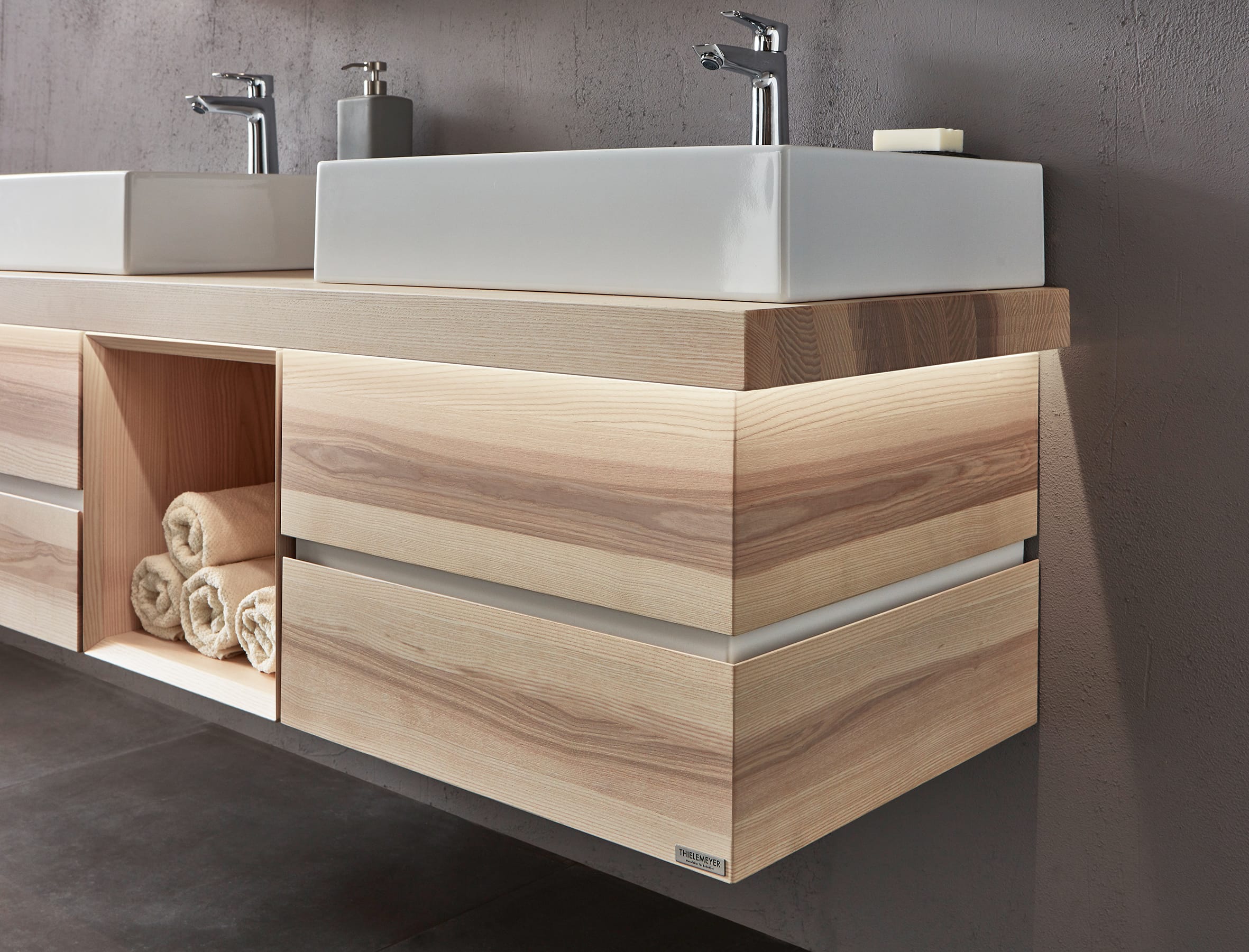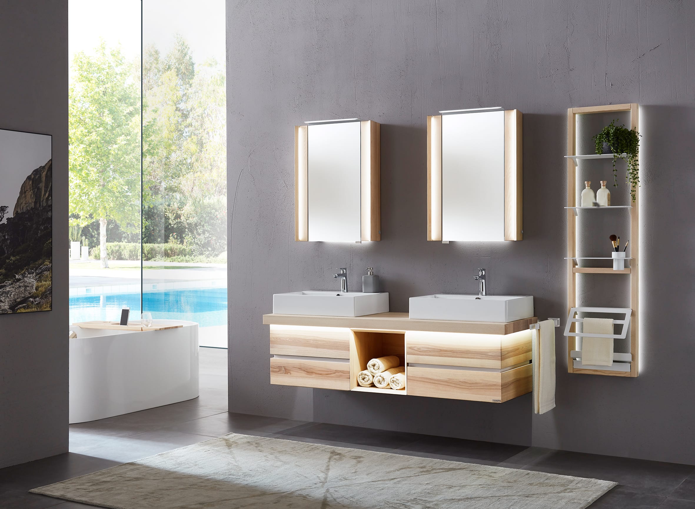 Die Badmöbel-Kombination aus der Serie Fresh vom deutschen Markenhersteller Thielemeyer besticht durch puristisches, geradliniges Design und verleiht dem Raum dadurch eine ursprüngliche Natürlichkeit.