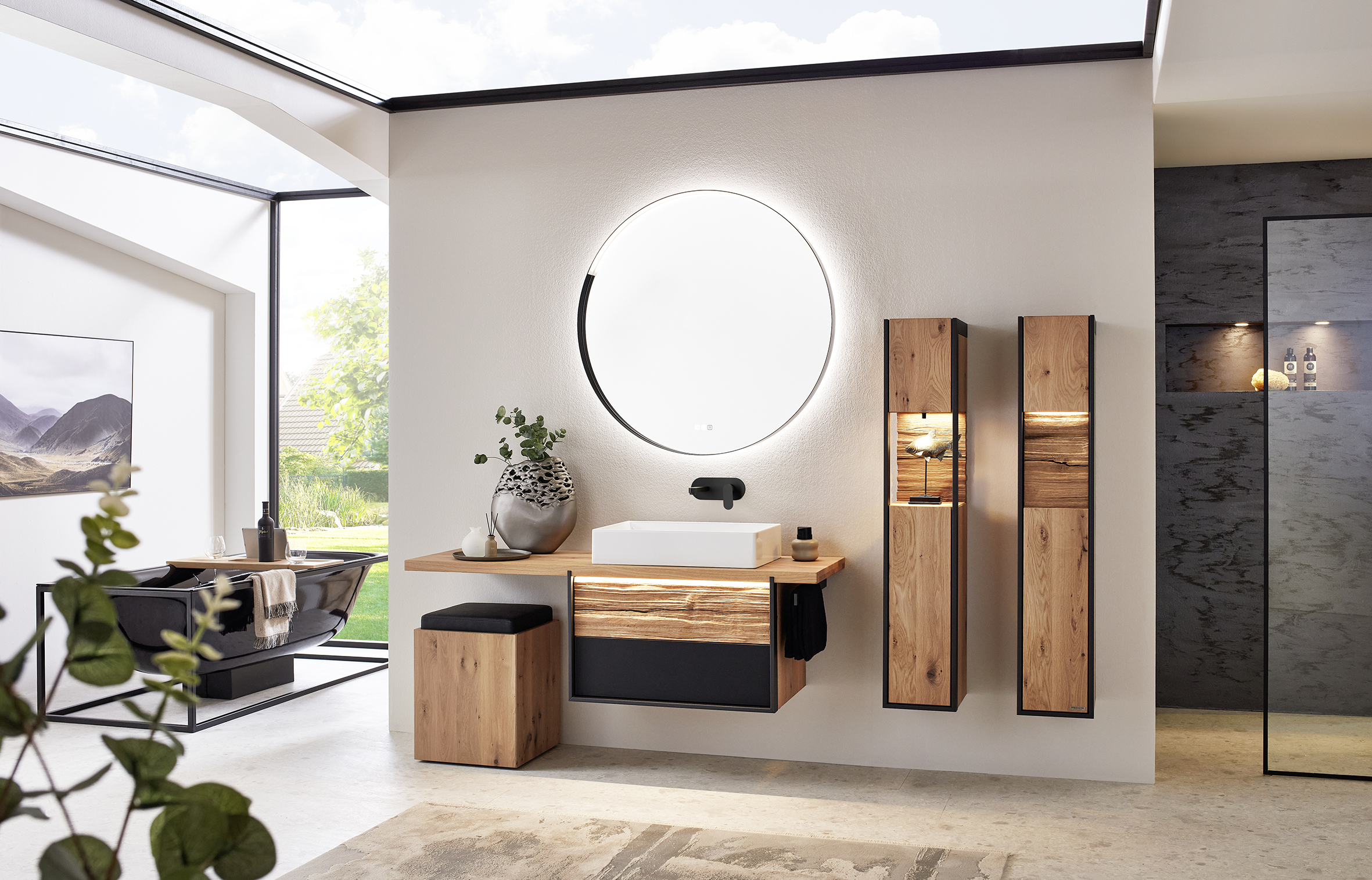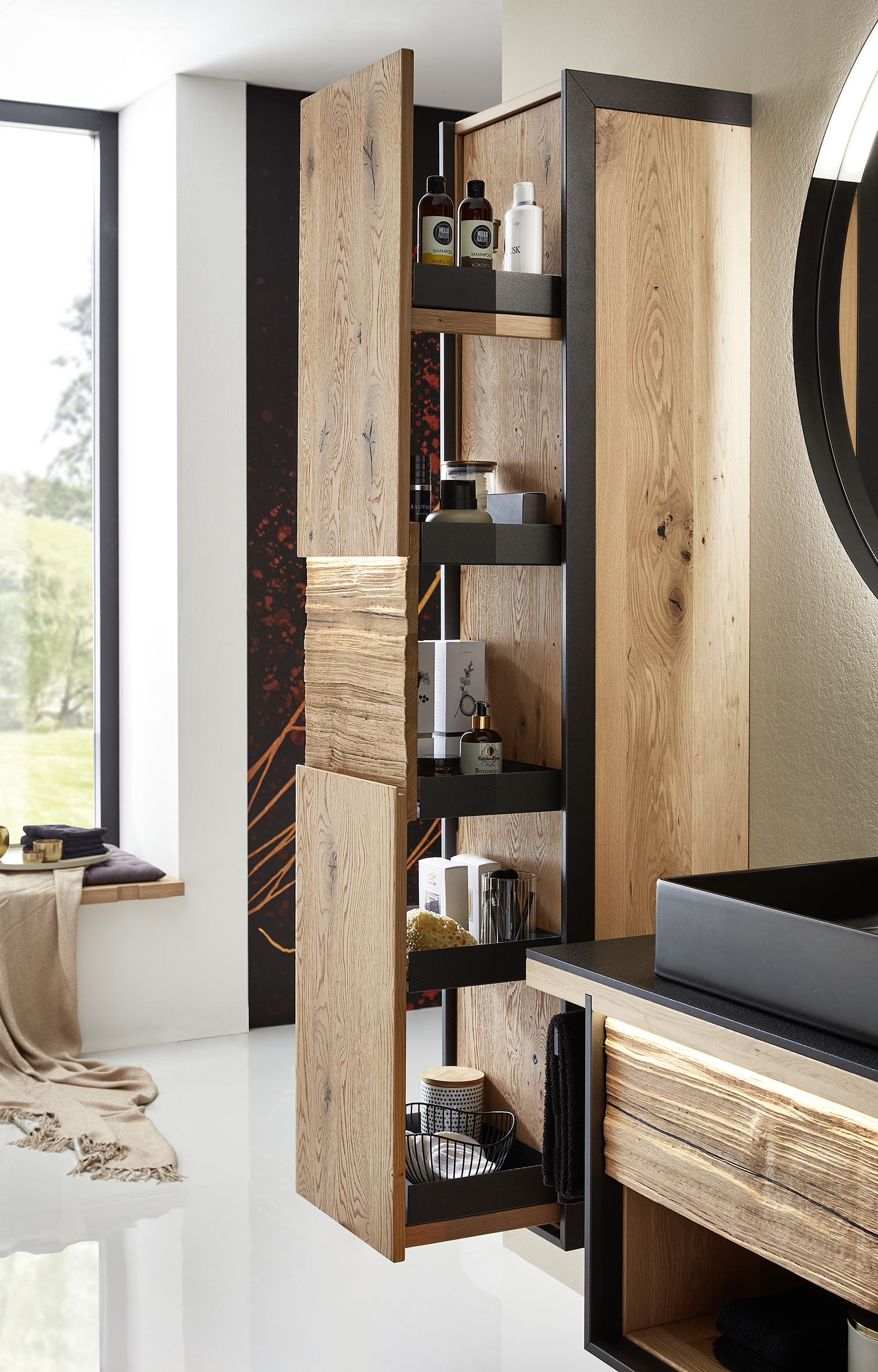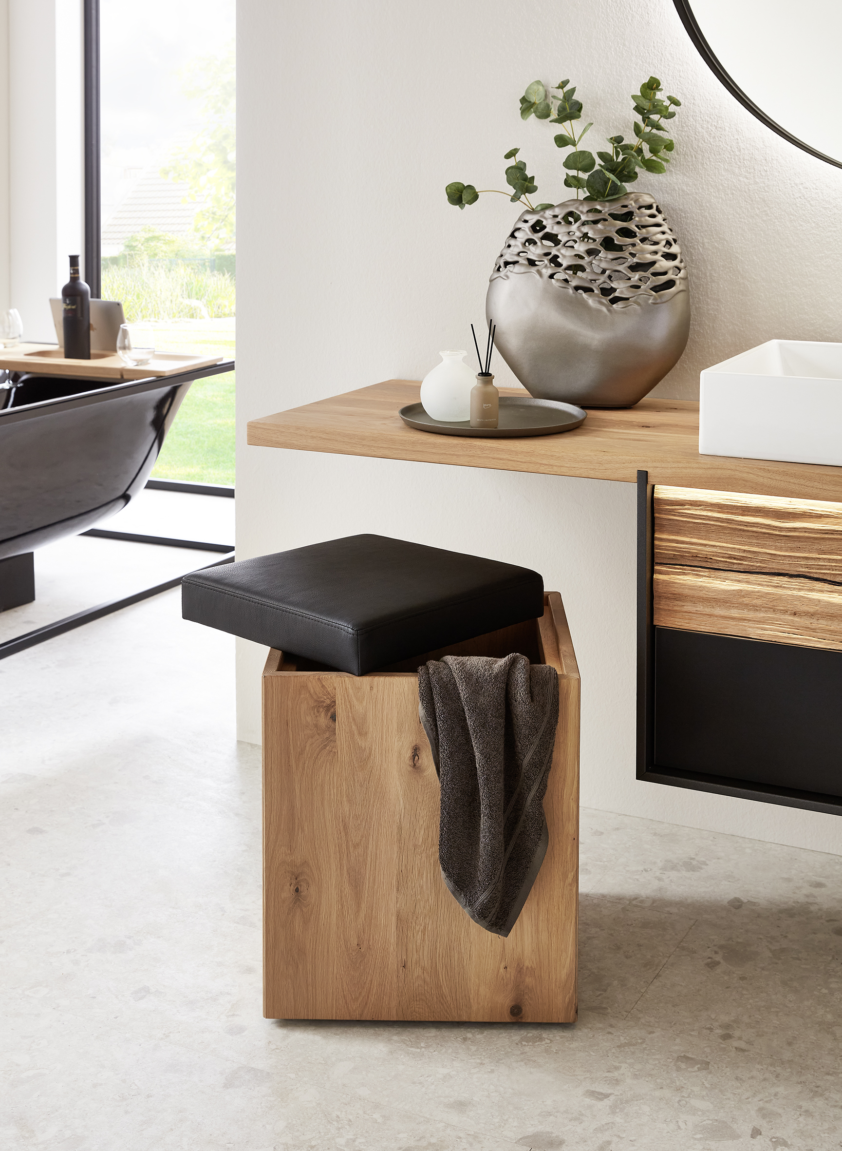 Dieses Badmöbel-Set aus der Serie Steel vom deutschen Markenhersteller Thielemeyer zeichnet sich durch puristisches, geradliniges Design aus und verleiht dem Raum dadurch eine ursprüngliche Natürlichkeit.